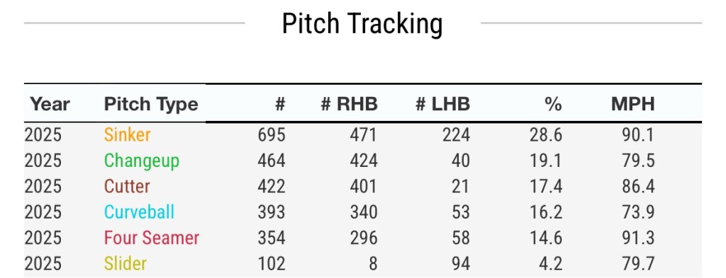 Suárez is sort of a throwback pitcher who relies on pitchability and finesse as opposed to high velocity. His five-pitch mix with pinpoint control has turned Suárez into one of baseball’s most reliable starting pitchers. An area where Suárez truly stands out is his ability to change speeds. His changeup is 11 MPH slower than his sinker, and his curveball is 17 MPH slower and drops 14 inches.