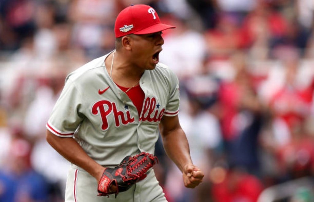 ATLANTA, GEORGIA – OCTOBER 11: Ranger Suarez #55 of the Philadelphia Phillies celebrates striking out Travis d’Arnaud #16 of the Atlanta Braves while the bases are loaded during the third inning in game one of the National League Division Series at Truist Park on October 11, 2022, in Atlanta, Georgia. (Photo by Patrick Smith/Getty Images)