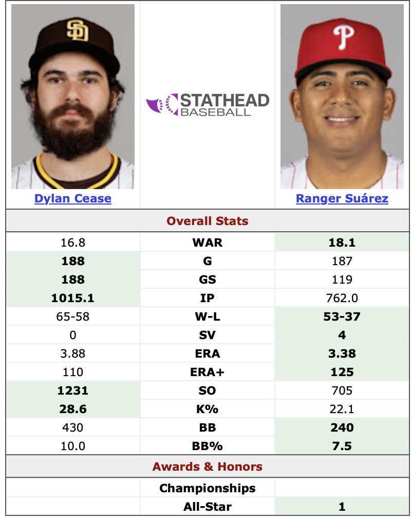 Dylan Cease signed a 7 year, 210-million-dollar contract with the Toronto Blue Jays this offseason. Since 2022, Dylan Cease has posted a 3.67 ERA across 130 starts, including 52 quality starts. Suárez, meanwhile, has posted a 3.59 ERA in 104 starts with 50 Quality Starts. Obviously, Cease’s durability and high strikeout rate make a difference, but Suárez walks fewer batters, induces weaker contact, and generates nearly identical results. However, Cease got two additional years and an extra five million per year, despite being the same age as Suárez. Safe to say the Red Sox got a fair deal from Scott Boras with Ranger Suárez.